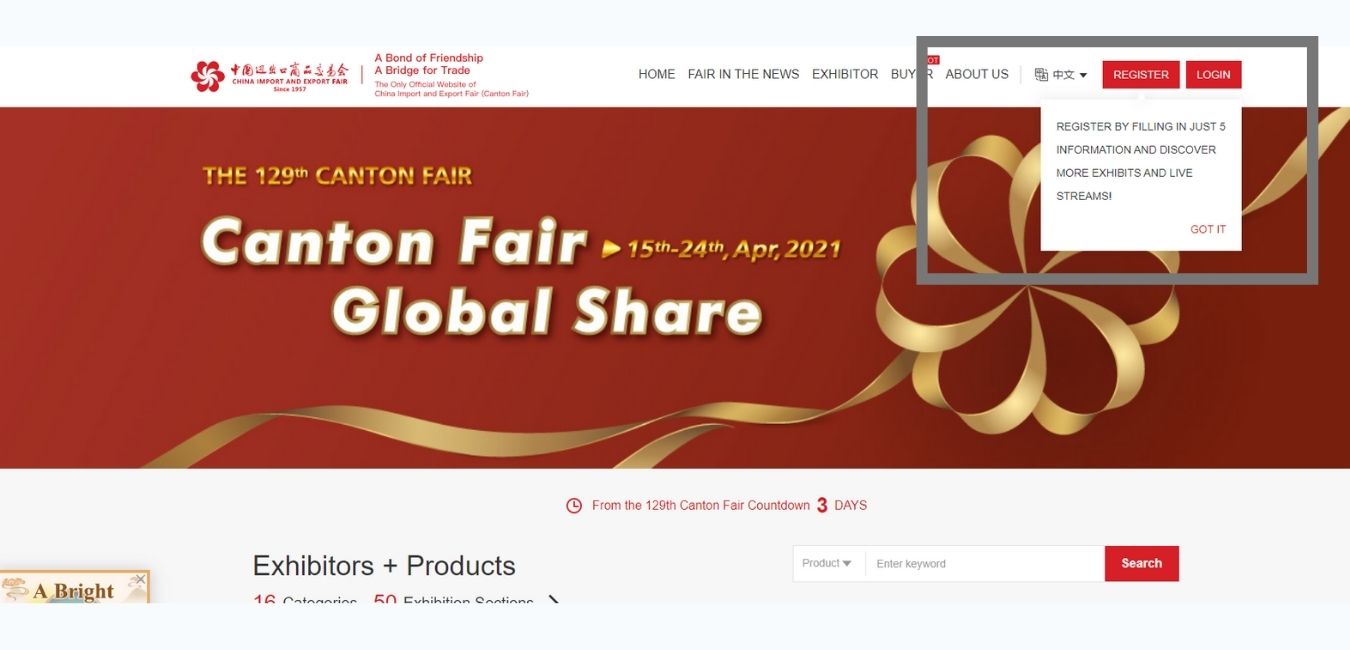 If you are interested in registering, the first step is to visit the Canton Fair’s official website. On the top right corner of any web page there, people will be able to find a “Register” button on the top right hand corner of the screen.