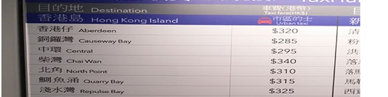 How much does it cost to get to downtown Hong Kong from the airport? Common, logical question, and the airport has provided a list of average taxi fares for reference. Fares differ based on the specific destinations in the following areas: