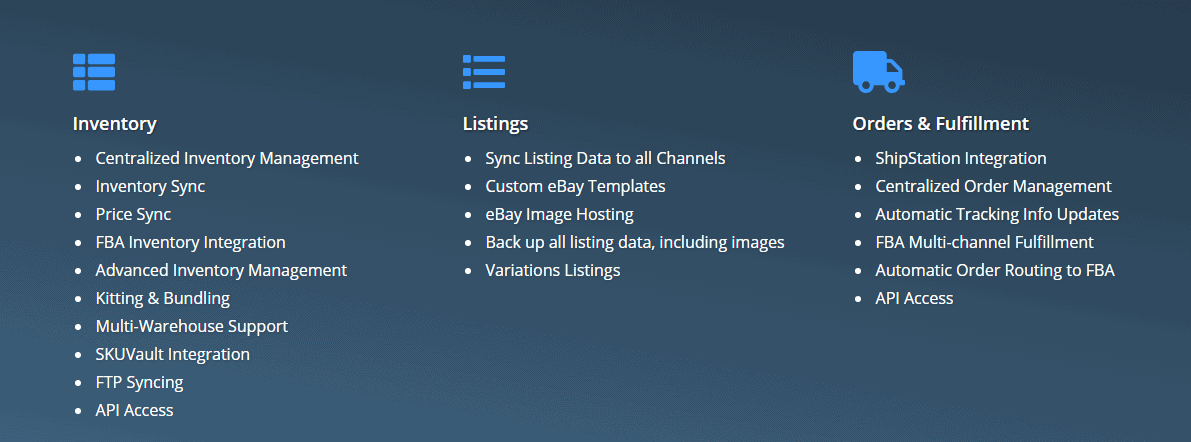 In terms of product listings, this service automatically syncs your listing information to all e-commerce channels you participate in.