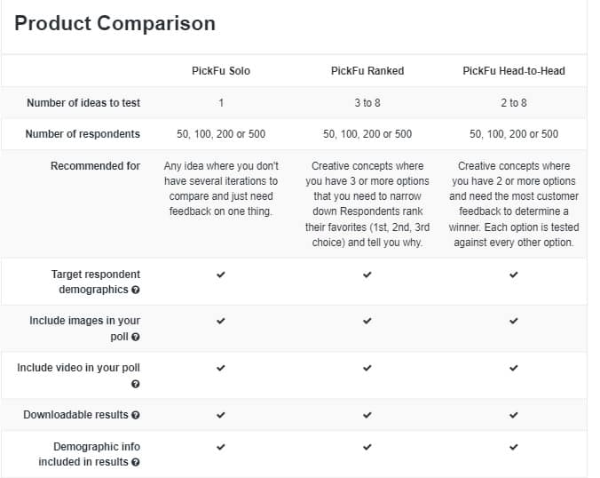For an easier reference to the products of PickFu, here’s a product comparison straight from Pickfu’s website: