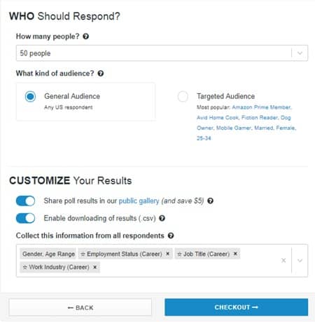 In the second window you will be asked how many respondents you would want. The options are 50, 100, 200 and 500. You will also be asked the kind of audience you want to participate in the poll, whether it’s a general audience or a targeted audience. And, you can also get to choose the demographics of your audience.