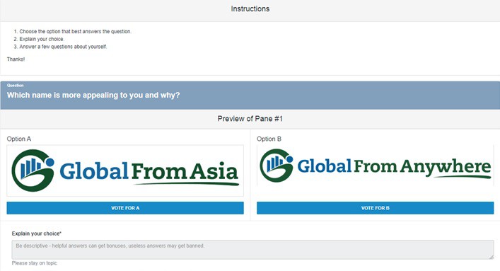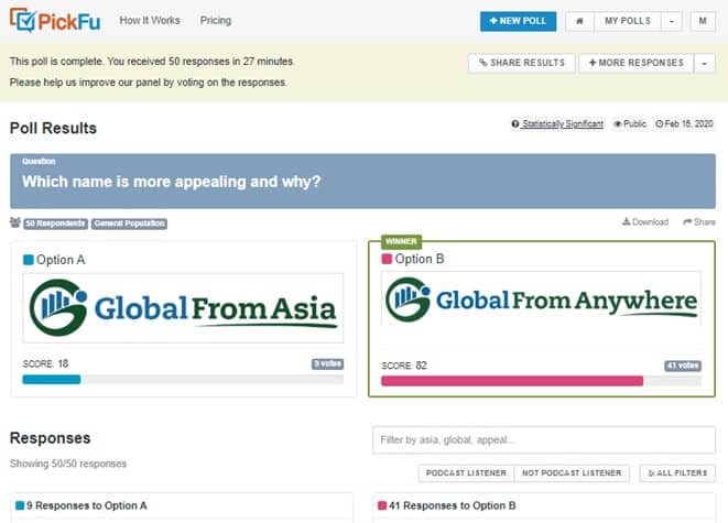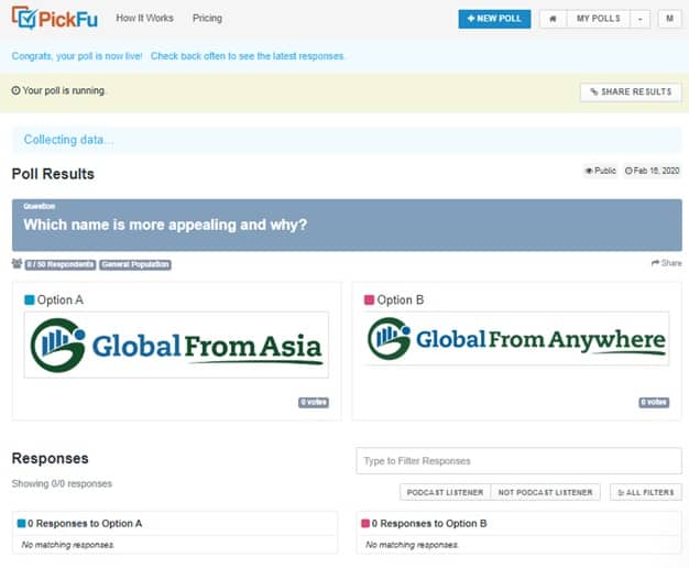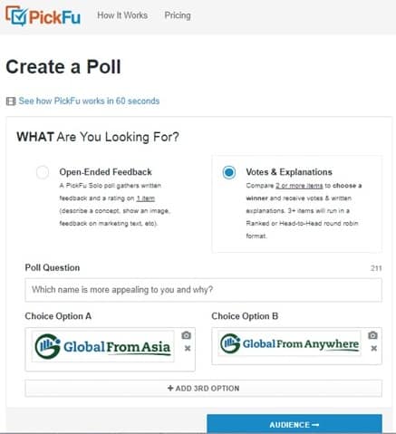 There are 3 types of PickFu polls to choose from, depending on what kind of feedback you need from the audience. We at Global From Asia tried PickFu to guide us in our ongoing discussion whether to rename from Global From Asia to Global From Anywhere. You will find out at the end of this section which type of poll we decided to run.